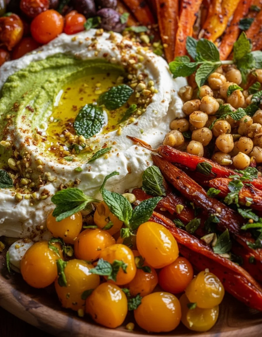 A vibrant Mediterranean burrata roasted carrot board brimming with creamy burrata, sweet roasted carrots, silky hummus, crunchy nuts, and fresh herbs—ideal for sharing at a relaxed gathering.